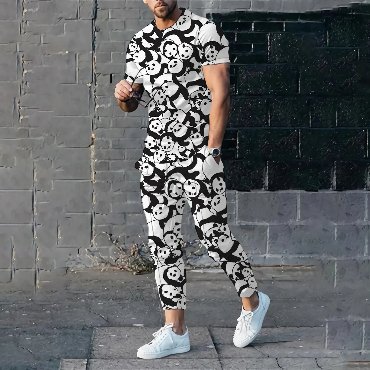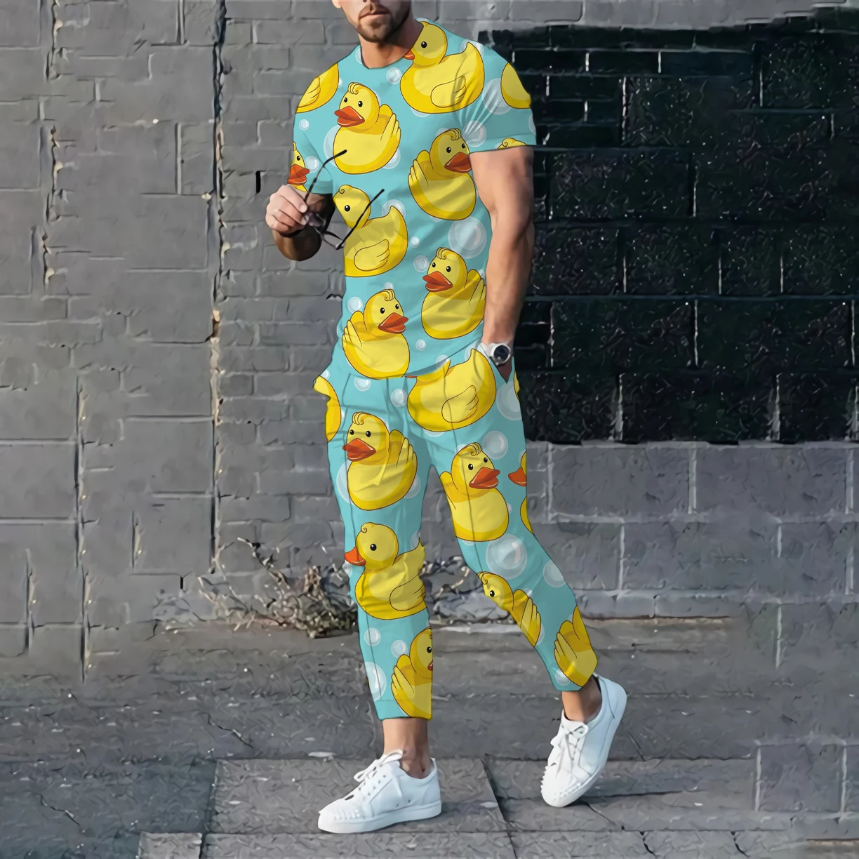 طقم ملابس رياضية رجالي مطبوع عليه بطة مضحكة ثلاثية الأبعاد، مكون من تي شيرت بأكمام قصيرة وبنطلون، مكون من قطعتين، بلوفر كبير الحجم، ملابس رجالية