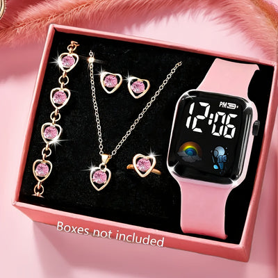 6pcs Women's Elegant & Cute Pink Smartwatch & Jewelry Set with Heart-Shaped Face, Interchangeable Strap, Necklace, Bracelet, Ring & Earrings - Digital Display Electronic Watch with Strap, Pink & Clear Bezel, Perfect for Daily