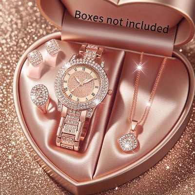 5pcs Luxury Women's Quartz Watch and Jewelry Set - Elegant Rose Golden-Tone Square Bezel, Interlocking Link Bracelet, -Accented Dial, Heart-Shaped Locket & Matching Earrings - Glamorous Gift Box Included, Perfect for Casual A
