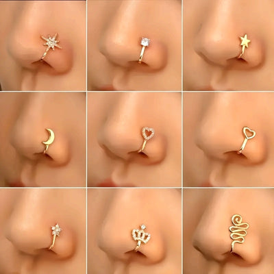 10pcs Set of Non-Piercing Nose Clips - Cute and Sexy Copper Cubic Synthetic Zirconia Design, U-shaped Heart, Crown, Butterfly and Star Patterns, Suitable for Daily Wear