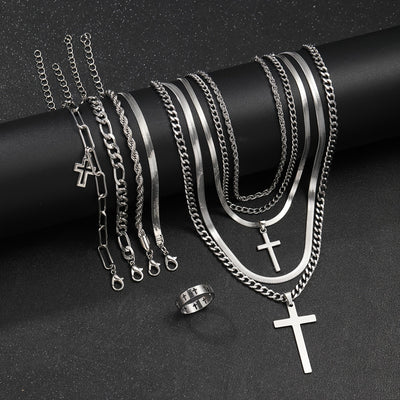 10pcs Casual Stainless Steel Cross Bracelet Necklace Ring Set for Men, Perfect for Vacation or Daily Wear, Gift Idea (No Box Included)