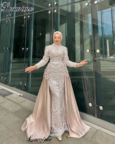 فساتين المشاهير بلون الشمبانيا من الشرق الأوسط مع ذيل قابل للفصل، فساتين المناسبات الرسمية الإسلامية، فساتين حورية البحر، فساتين السهرة