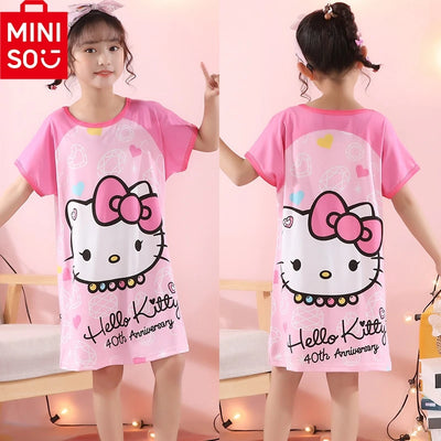 ملابس منزلية للأطفال من MINISO فستان نوم صيفي بأكمام قصيرة من Disney Hello Kitty Cat، بيجامات للبنات الصغار، ثوب نوم، ملابس نوم