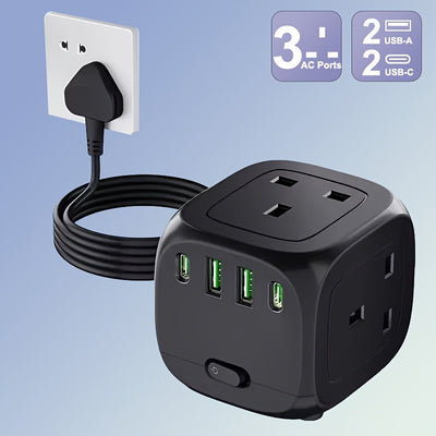 Multifunctional Wall Outlet Power Strip with 3 AC Ports, USB-A & Type-C, 2m Power Cord, 2 USB-A Ports, 2 Type-C Ports, Flat Design for Home, Kitchen, Office, Hotel & Cruise Travel, Travel Power Strip | Sleek Black Design | US