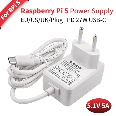 Raspberry Pi 5 مزود طاقة 27 واط 5.1 فولت 5 أمبير شاحن USB من النوع C شاحن USB من النوع C قابس الاتحاد الأوروبي الولايات المتحدة المملكة المتحدة لـ Raspberry Pi 5 / 4B RPI 5