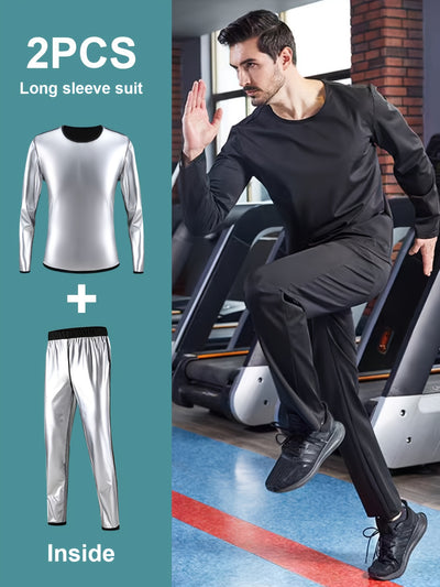 2pcs Men's sauna sports suit, including 1pc of plain sauna sports pants, elastic waist, casual sports trousers, medium elastic straight trousers and 1pc of round neck long-sleeved T-shirt, Men's sports top, sweat suit, compre