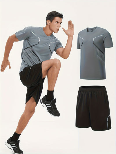 2pcs Men's Stripe Decor Short Sleeve T-shirt + Shorts Sports Set, Casual Quick-drying Summer Fitness Clothing As Gift