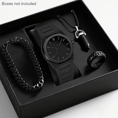 4pcs Men's Luxury Quartz Watch & Accessory Gift Set - Black Modern Polygonal Dial Analog Watch with Black Dial & White Hands, Black Strap, Matching Necklace & Ring - Battery-Powered Quartz Movement, Ideal Christmas/Birthday G