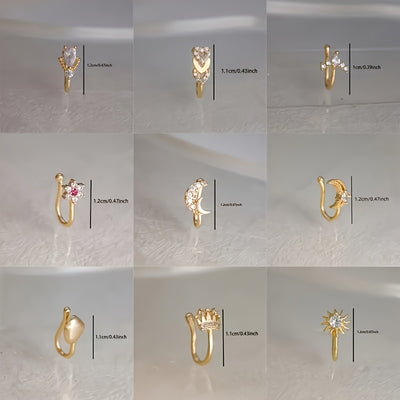 9pcs set of retro fashion bohemian copper inlaid synthetic Zirconia no-piercing love crown moon heart plum blossom sun shape U-shaped nose clip nose ring nose ornament for daily wear birthday party New Year gift