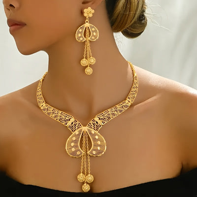 2025 New Bohemian 2pcs Hollow Flower Tassel Earrings and Necklace Elegant Ladies Jewelry Set, Perfect for Dubai Bridal Wedding Anniversary Gift, Valentine's Day, Christmas Eid, Daily Present for Wife, Family, Girlfriend