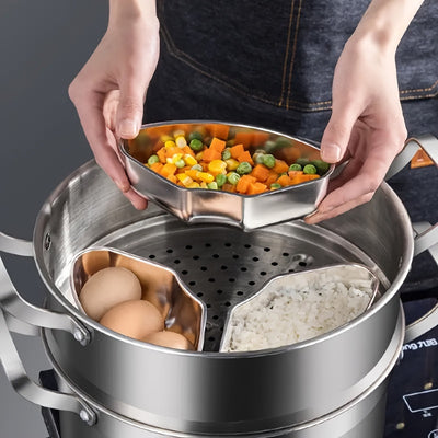 3-Piece Stainless Steel Steamer Insert Set, Fan-Shaped Divided Cooking Pans for Rice, Eggs, and Vegetables, No Electricity Needed, Kitchen Essentials