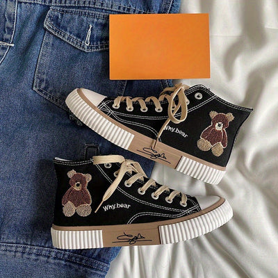 Women's Cute Bear Pattern Canvas Shoes, Casual Lace Up Outdoor Shoes, Comfortable High Top Shoes