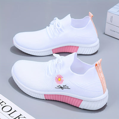 Women's Flower Pattern Sneakers, Breathable Flying Woven Outdoor Shoes, Lightweight Low Top Running Shoes
