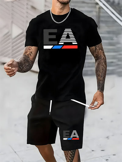 Men'S "EA" Graphic T-Shirt & Black Shorts Set - Breathable Summer Casual Wear with Colorful Stripes, Comfortable for Sports & Leisure, Perfect Gift for Men, Leisure Outfit | Trendy Casualwear | Comfortable Fit