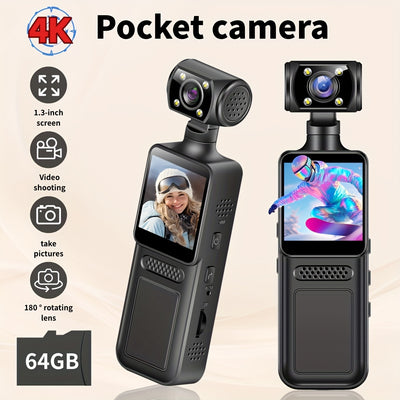 4K handheld stabilizer pocket sports camera, 4K HD camera with 180 ° rotating lens, 1.3-inch screen, portable rechargeable, Vlog camera, suitable for action shooting
