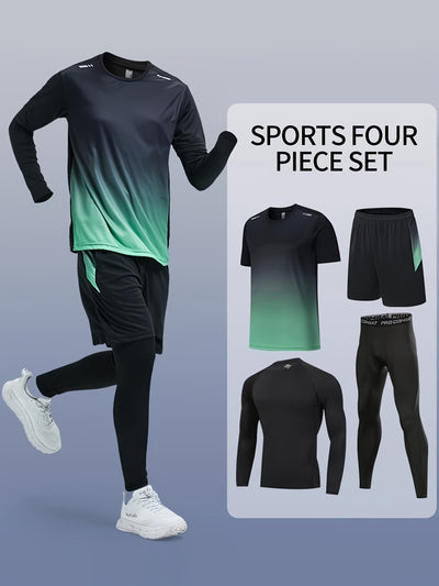 Men's Sports 4pcs Set, High Stretch Gradient Color T-shirt + Active Shorts + Leggings + Long Sleeve Compression Shirt Matching Set For Running Fitness
