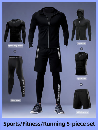 Men'S 5pcs Athletic Apparel Set - Hooded Jacket, Long Sleeve Compression Shirt, Short Sleeve Compression Top, Running Tights, and Shorts - Polyester High Stretch Fabric, Zip Detail, for Training, Hiking, Basketball, Gym - Fou