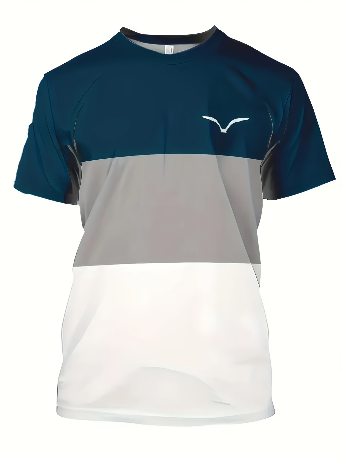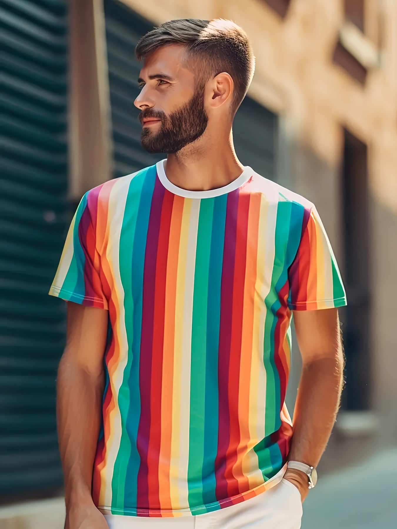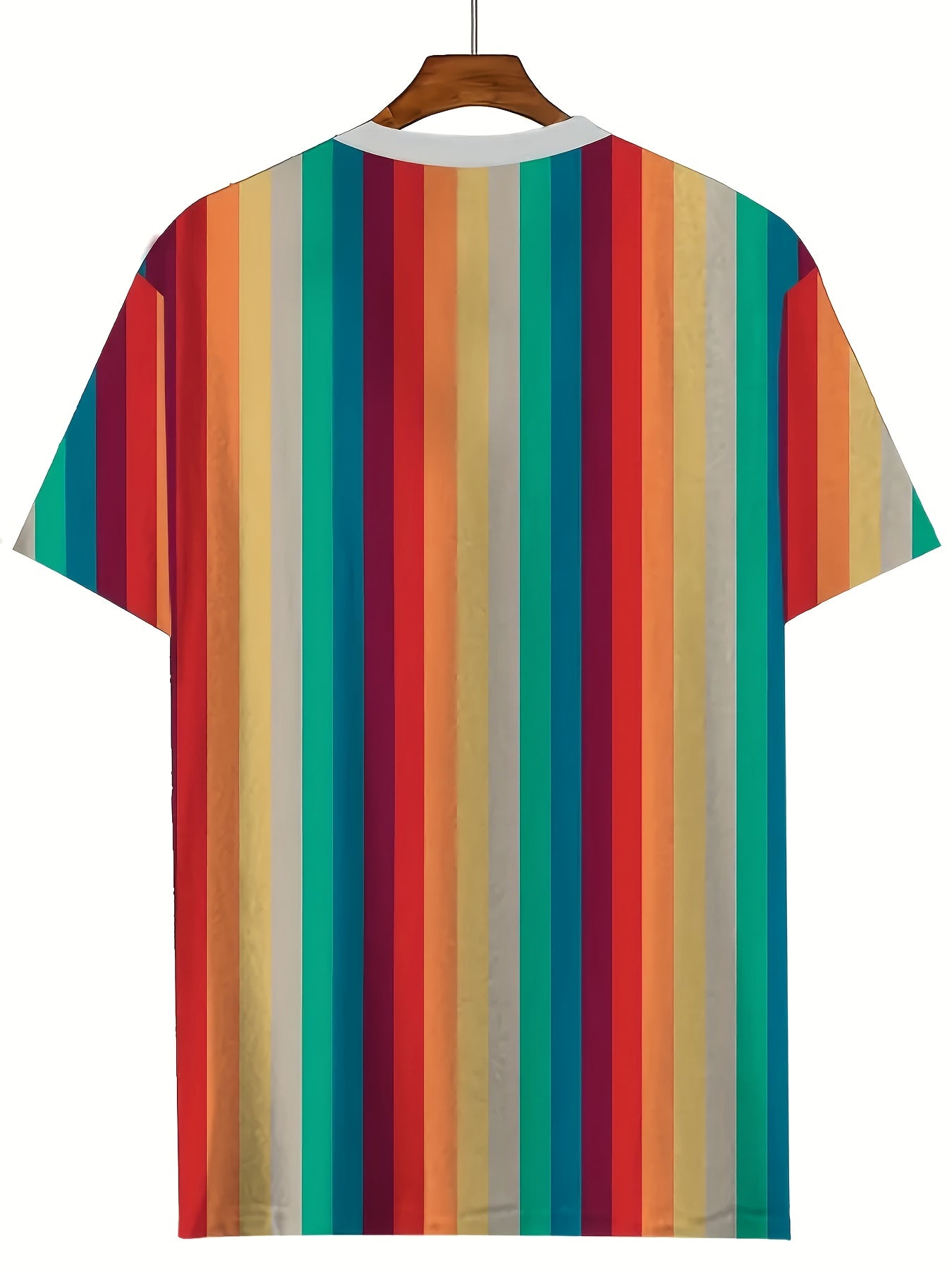 1pc Men'S Casual Crew Neck T-Shirt, Geometric Striped Print, Breathable Polyester Knit Fabric, Short Sleeve Sports Tee for Spring/Summer, Street Fashion Style