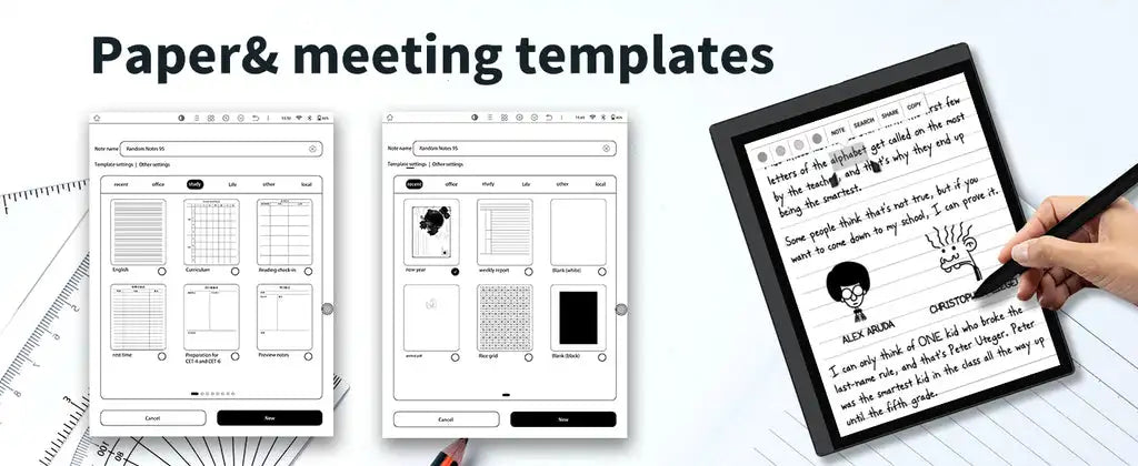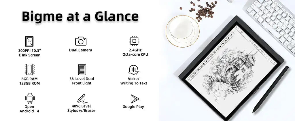 شاشة 10.3 بوصة بتقنية الحبر الإلكتروني بدقة 300 بكسل لكل بوصة | كاميرا مزدوجة | معالج ثماني النواة بتردد 2.4 جيجاهرتز | ذاكرة وصول عشوائي (RAM) سعة 6 جيجابايت + ذاكرة تخزين داخلية سعة 128 جيجابايت | إضاءة أمامية مزدوجة بـ 36 مستوى | كتابة نص صوتي | نظام أندرويد 14 مفتوح | قلم لمس بـ 4096 مستوى مع ممحاة | جوجل بلاي